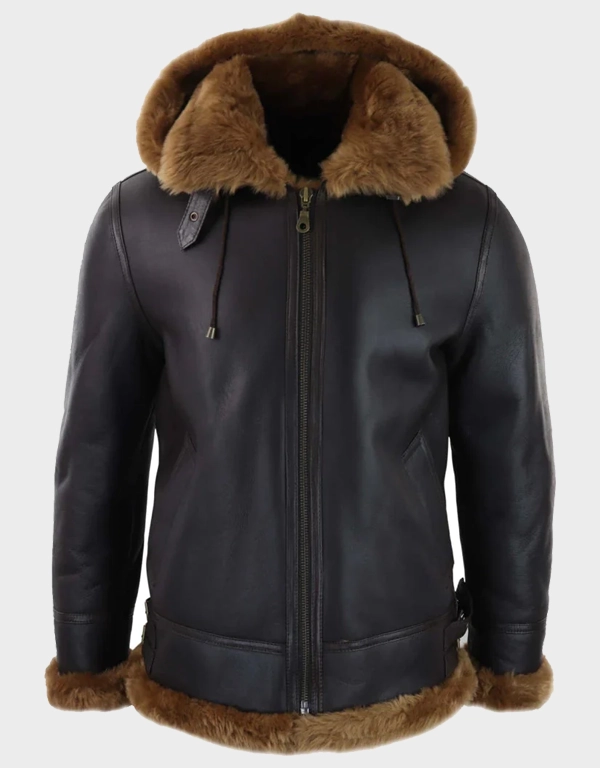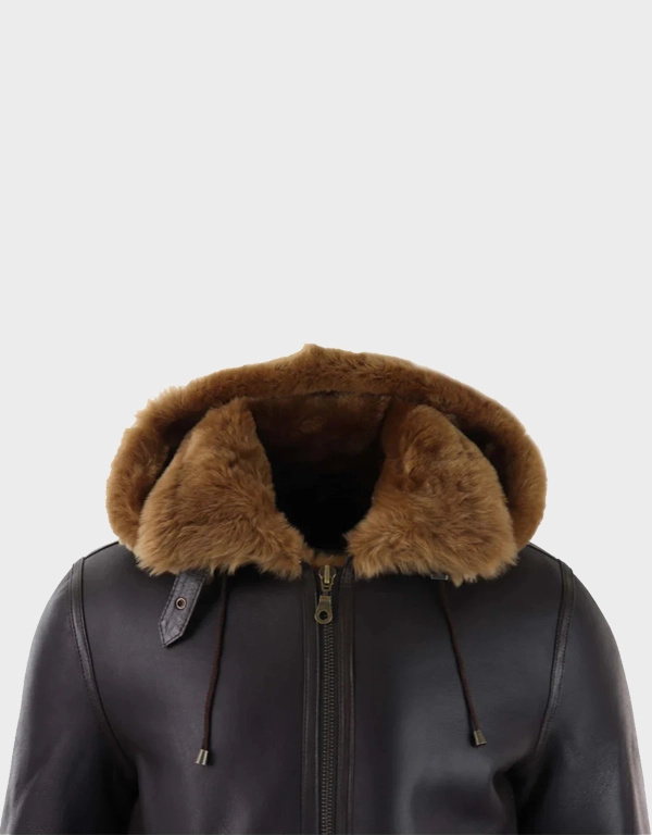 Men’s Brown Leather Shearling Aviator Jacket with Hood
