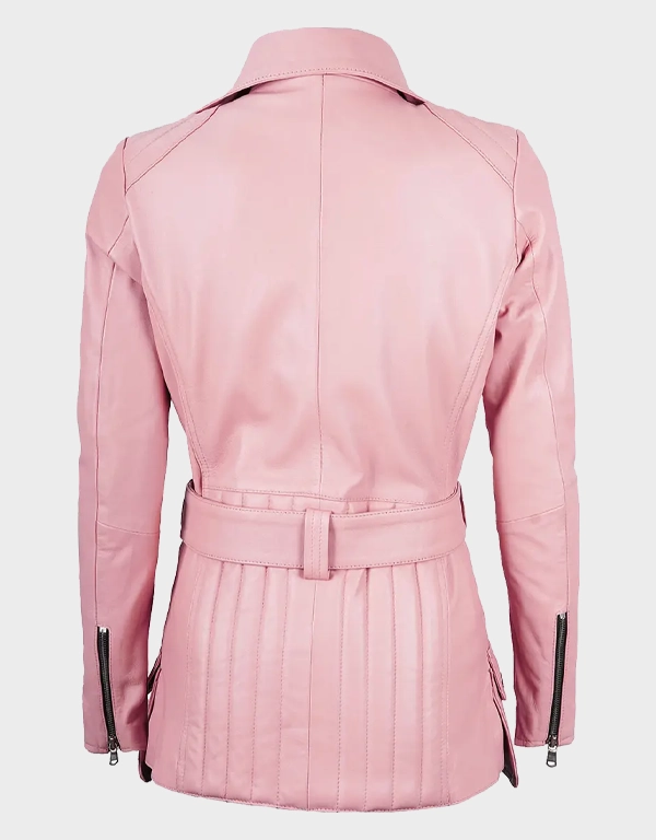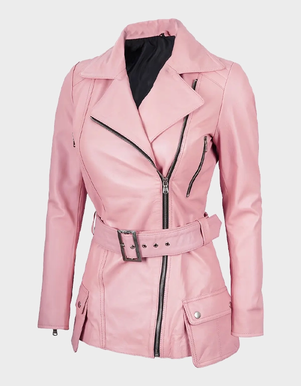 Women’s Pink Asymmetrical Belted Leather Jacket