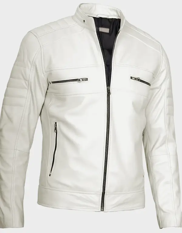 The Off White Men Cafe Racer Leather Jacket is crafted from real lambskin leather, offering durability and a soft, comfortable feel. Its clean off-white shade gives it a versatile look that pairs well with both casual and semi-formal outfits. Designed with a stand collar and smooth YKK zipper, the jacket features minimalistic seam detailing and functional front zip pockets on the chest and waist. This cafe racer jacket has a slim-fit cut that follows the natural shape of the body, making it a practical and stylish choice for men who prefer refined leather outerwear. Suitable for everyday use, motorbike rides, or seasonal layering, this men’s leather jacket combines classic biker style with modern simplicity.